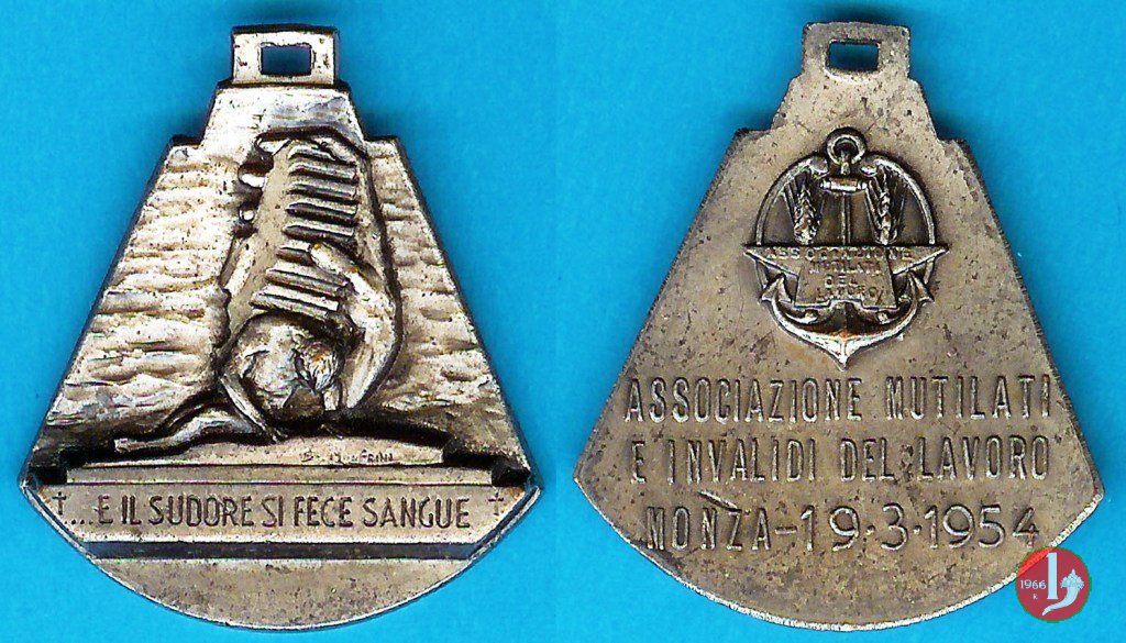 Ass. Mutilati e Invalidi del Lavoro 1954 Dritto: Monumento ai Caduti del Lavoro eretto in piazza della Stazione a Monza a cura dell'associazione alla base, a dx: Silvio Monfrini in esergo, entro nastro orizzontale: ✠...E IL SUDORE SI FECE SANGUE ✠ sotto, nel campo: ASSOCIAZIONE MUTILATI = E INVALIDI DEL LAVORO = MONZA - 19 • 3 • 1954 | |