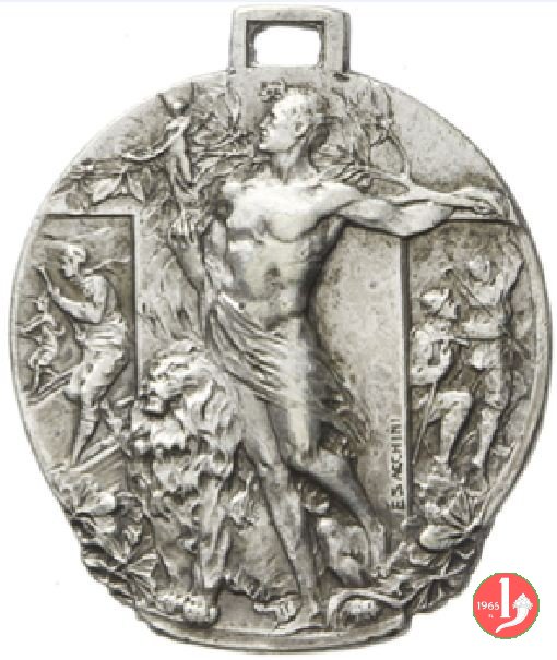Società Alpinisti 1912 Dritto: uomo in piedi, volto a sx, affiancato da leone, regge statuetta della vittoria e ramo d'alloro; ai lati Alpinisti in attività a sx, verticalmente: E. SACCHINI sotto: AS in basso: E. SACCHINI | |