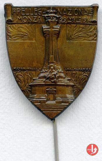 Distintivo - 1° Pellegr. Nazionale 1914 Dritto: nel nastro in alto: I° PELLEG.io _ NAZIONALE = MONZA _ 29 LUGLIO 1914 su Croce: la Cappella Espiatoria alla base dei bracci orizzontali: MARIO NELLI _ INC. FIRENZE | |