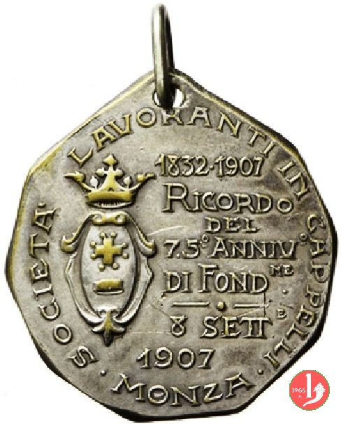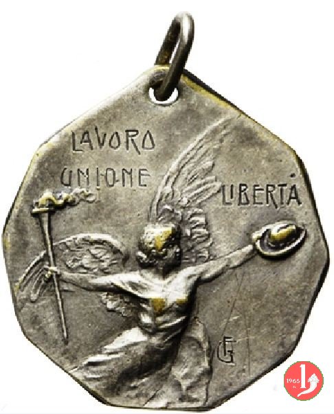 Società Lavoranti in Cappelli 1907 Dritto: mezzo busto di figura angelica volta a sx, regge torcia e cappello nel campo, in alto: LAVORO = UNIONE _ LIBERTA' in basso,a dx: GF nel campo, a sx: Stemma coronato entro cartiglio nel campo, a dx: 1832-1907 = RICORDO = DEL = 75° ANNIV. = DI FOND.ne = - • - = 8 sett. = 1910 | |