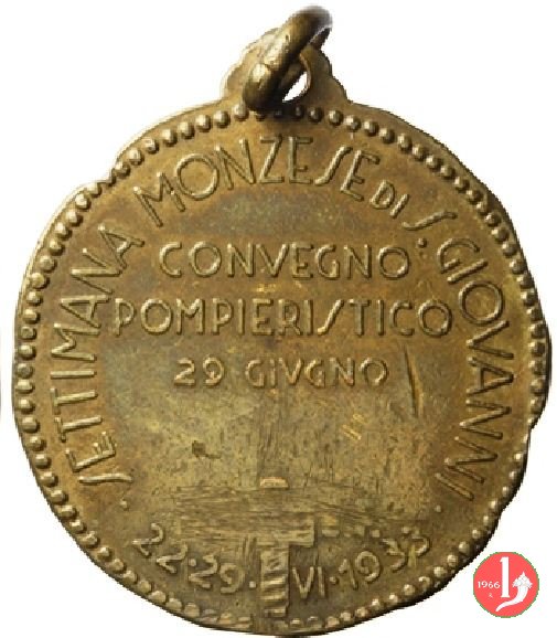 Settimana Monzese di San Giovanni 1933 Dritto: Stemma turrito della Città di Monza con smalti rossi e blu e motto sul contorno: EST • SEDES • ITALIAE • REGNI • MODOETIA • MAGNI in basso, a dx: LANDI nel campo: CONVEGNO = POMPIERISTICO = 29 GIVGNO | |