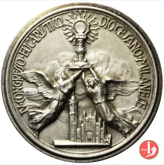 IV Congresso Eucaristico 1945 45mm Dritto: IV • CONGRESSO • EUCARISTICO _ DIOCESANO • MILANESE due Angeli sorreggono ostensorio su vista del Duomo di Monza in esergo: E. BERTONI nel campo, in alto: VOI MI INVOCHERETE = ED IO VI ESAUDIRO' nel campo, a dx: MONZA = SETTEMBRE = 1945 | |