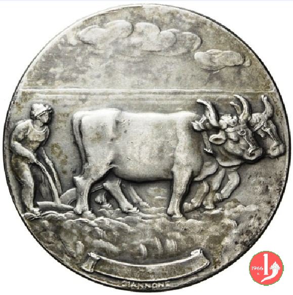 Sagra di San Giovanni - BNA 1967 Dritto: Contadino ara con biga di buoi verso dx in basso, sotto a cartiglio: GIANNONE nel campo: MOSTRA ZOOTECNICA = SAGRA DI S. GIOVANNI 1967 = MONZA in basso: cornucopie decussate con spighe e frutti | |