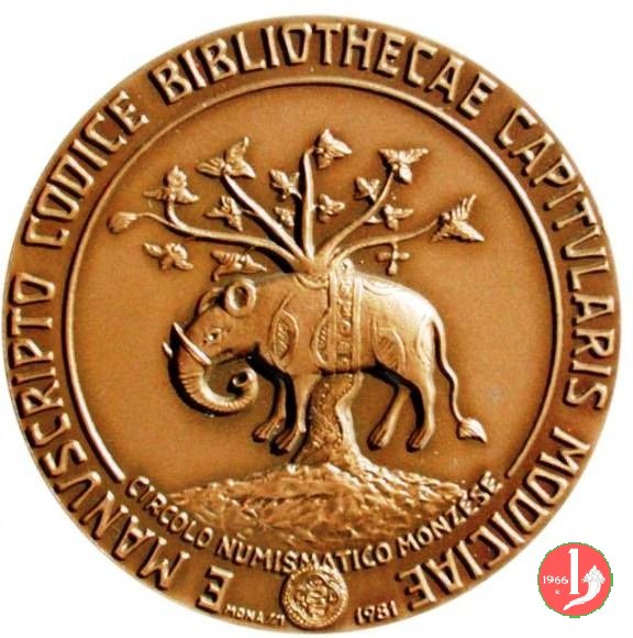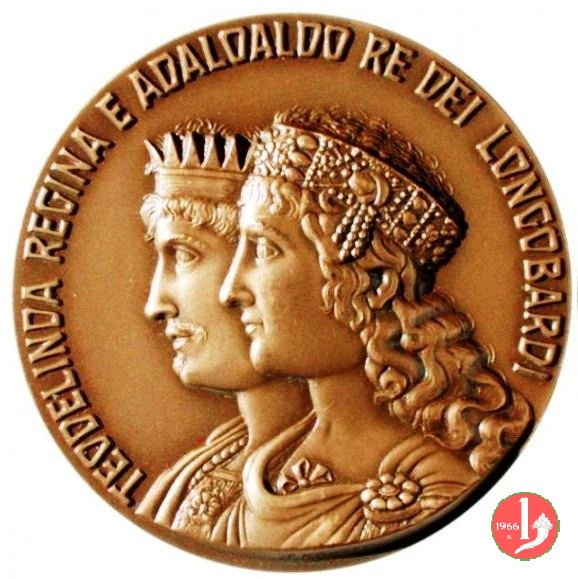 Teodolinda e Adaloaldo 1981 Dritto: TEODELINDA REGINA E ADALOALDO RE DEI LONGOBARDI busti accollati e coronati a sx elefante a sx, trafitto da albero sotto: CIRCOLO NUMISMATICO MONZESE in basso, ai lati: MONASSI _ 1981 | |