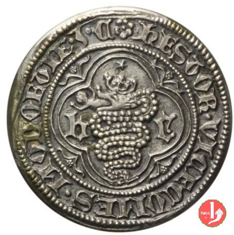 in basso, a dx: P.M. entro cerchio perlinato e in cornice quadrilobata, decorata con quattro fiori: biscione Visconteo che divora fanciullo, ai lati: H _ C | |