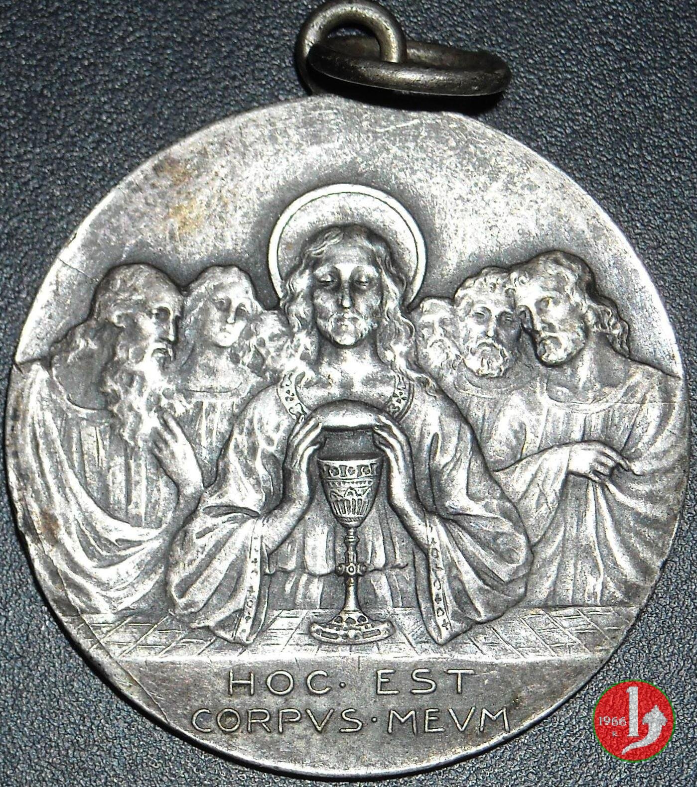 Confraternite SS. Sacramento - S. Carlo Dritto: Gesú nimbato e seduto di fronte, tra gli Apostoli, eleva il Pane sul Calice in esergo: HOC • EST = CORPVS • MEVM a sx: stelo di giglio campo vuoto per dedica | |