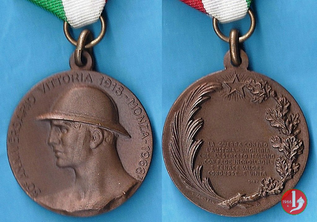 Cinquantesimo della Vittoria 1968 Dritto: 50° ANNIVERSARIO VITTORIA 1918 - MONZA - 1968 testa elmata di giovane militare a sx in basso: S. JOHNSON _ A.C. | |