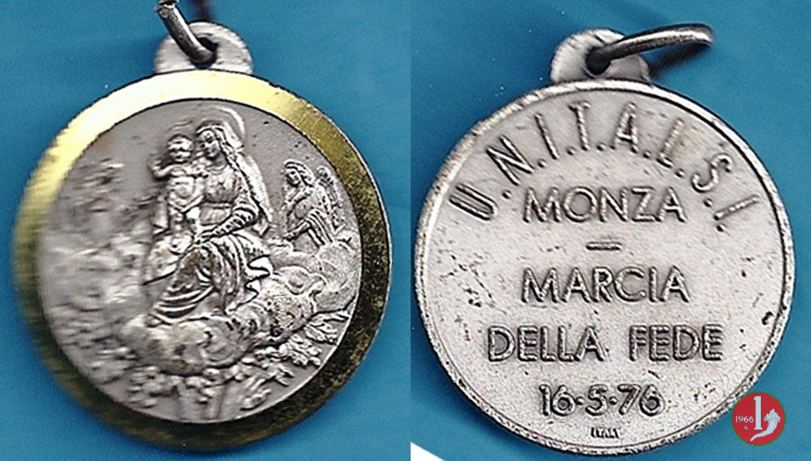 UNITALSI - Marcia della Fede 16-05-1976 Dritto: L'immagine della B. V. col Bambino su albero e nube tra due Angeli Verso: U.N.I.T.A.L.S.I. nel campo: MONZA = - = MARCIA = DELLA FEDE = 16 • 5 • 79 in basso: ITALY | |