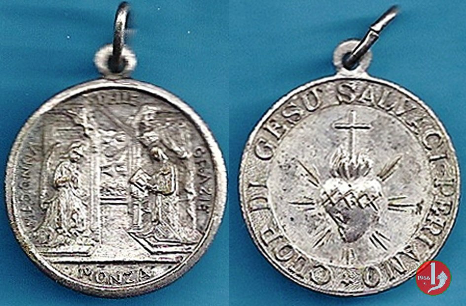 Madonna delle Grazie Dritto: MADONNA _ DELLE _ GRAZIE scena dell'Annunciazione dell'Angelo a Maria in esergo: MONZA Sacro Cuore fiammante con croce e corona di spine | |
