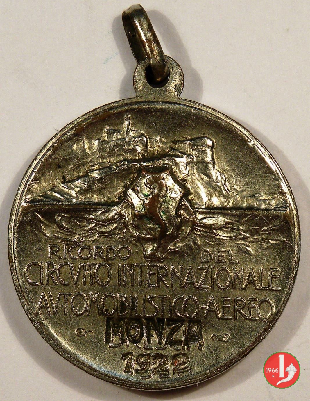Circuito Automobilistico - Aereo di Monza 1922 Dritto: Aereo e Automobile in corsa nel paesaggio Verso: nel semi-campo superiore Stemma di Brescia sulla vista del Castello di Brescia sotto: RICORDO _ DEL = CIRCVITO INTERNAZIONALE = AVTOMOBILISTICO-AEREO = fregio MONZA (inciso) fregio = - = 1922 (inciso) | |