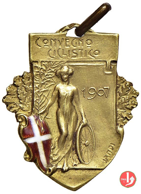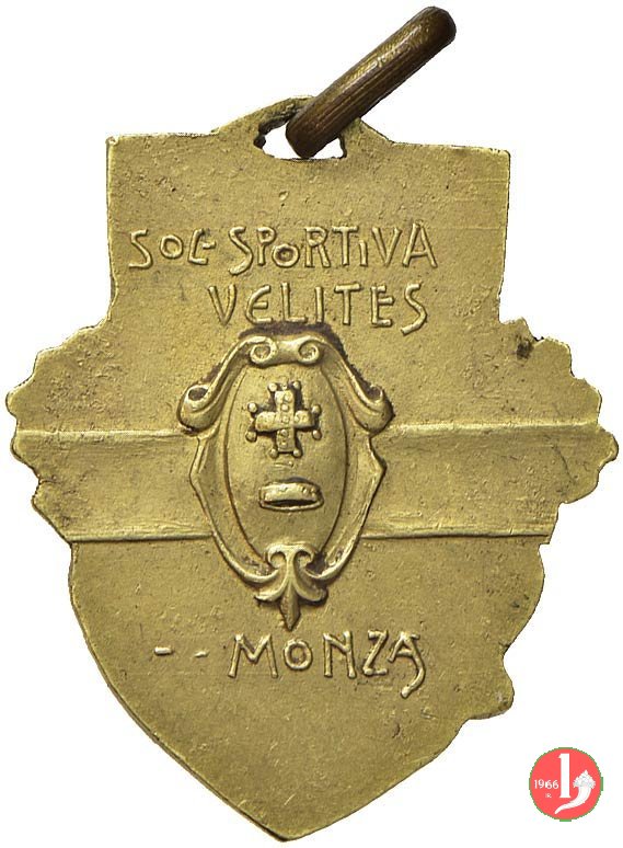 Società Sportiva Velites 1907 Dritto: tra fronde d'alloro e quercia: in alto: CONVEGNO = CICLISTICO figura femminile velata, in piedi di fronte regge stemma di Monza in smalti e ruota di bicicletta nel campo, a dx: 1907 in basso, a dx: LANDI Stemma su nastro e in cartiglio in basso: - MONZA - | |