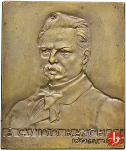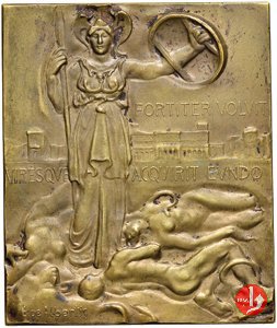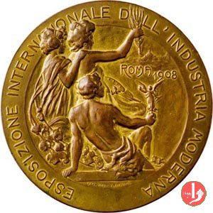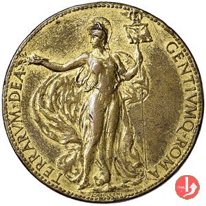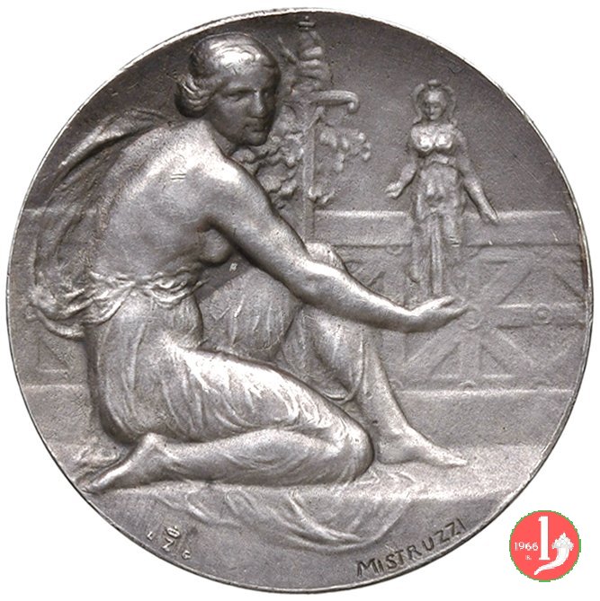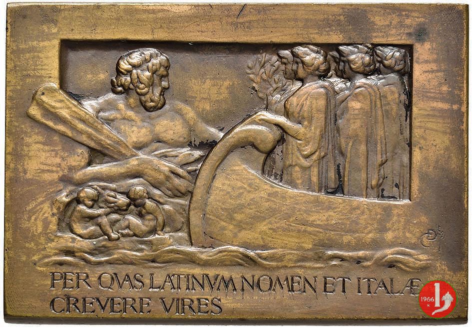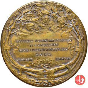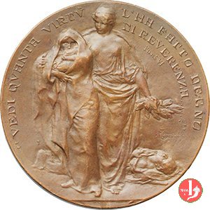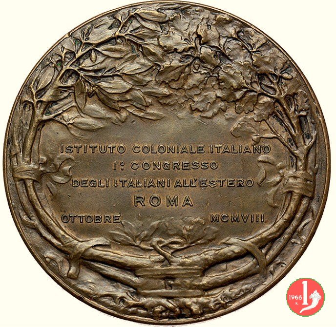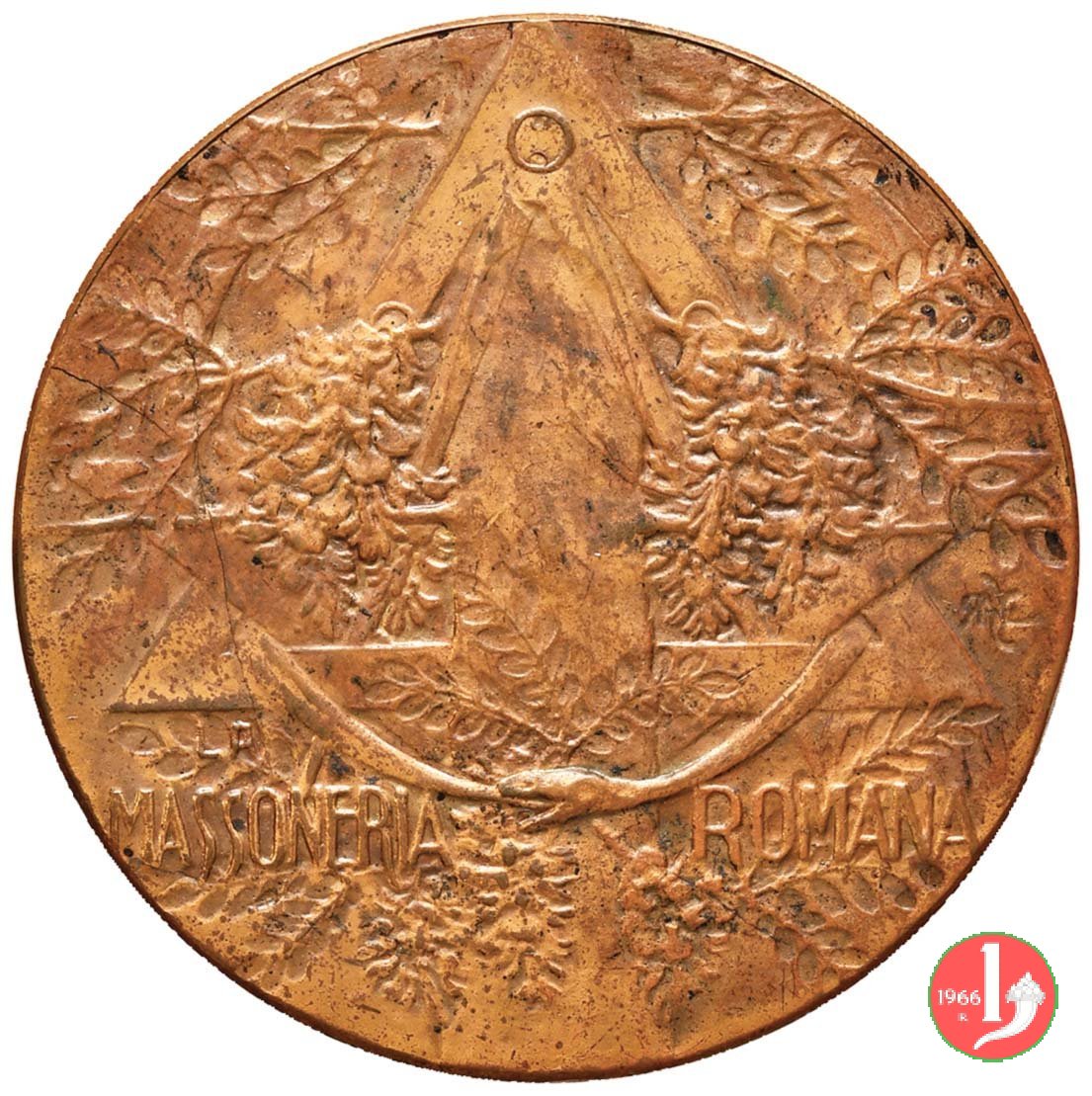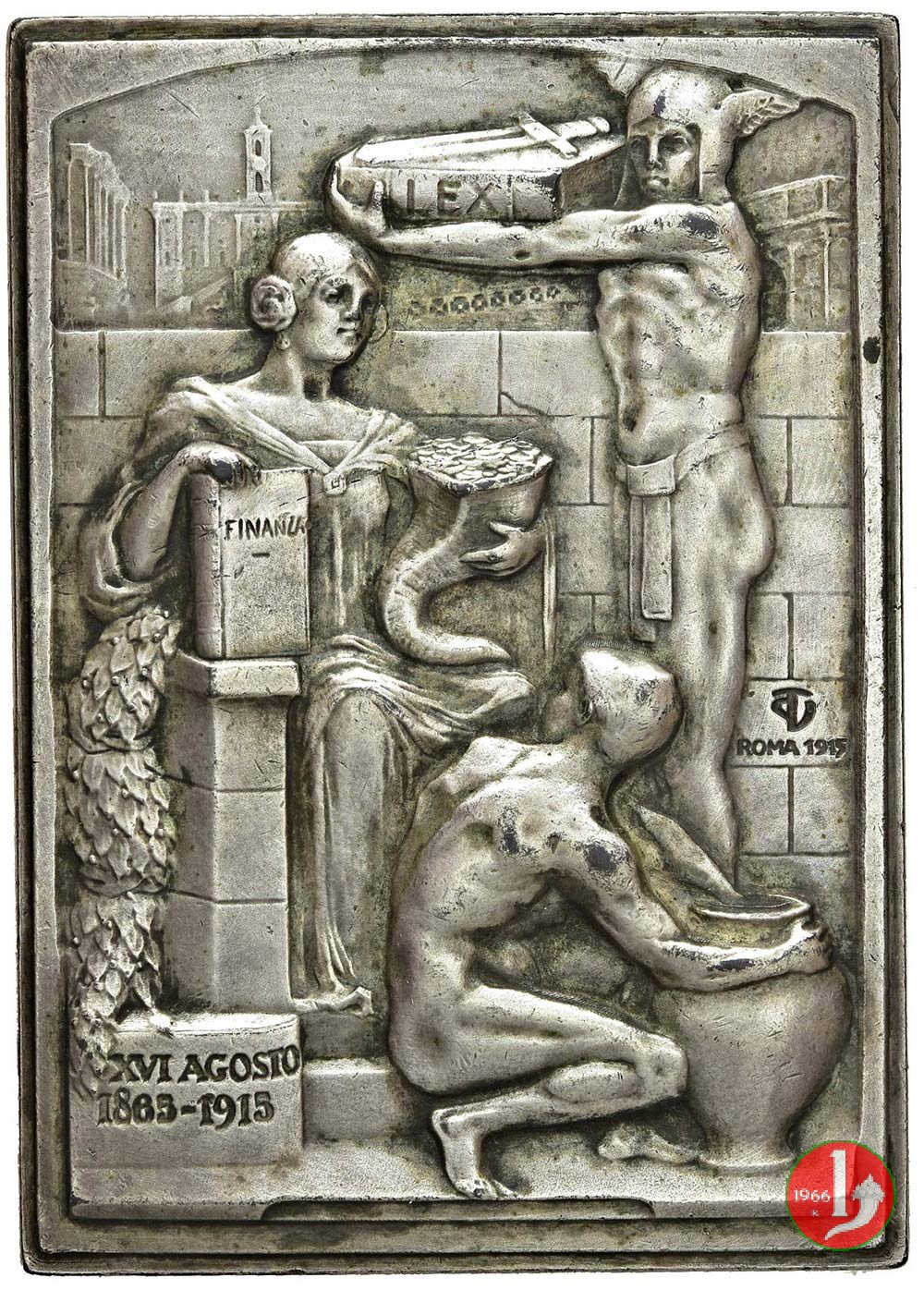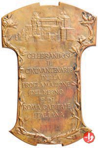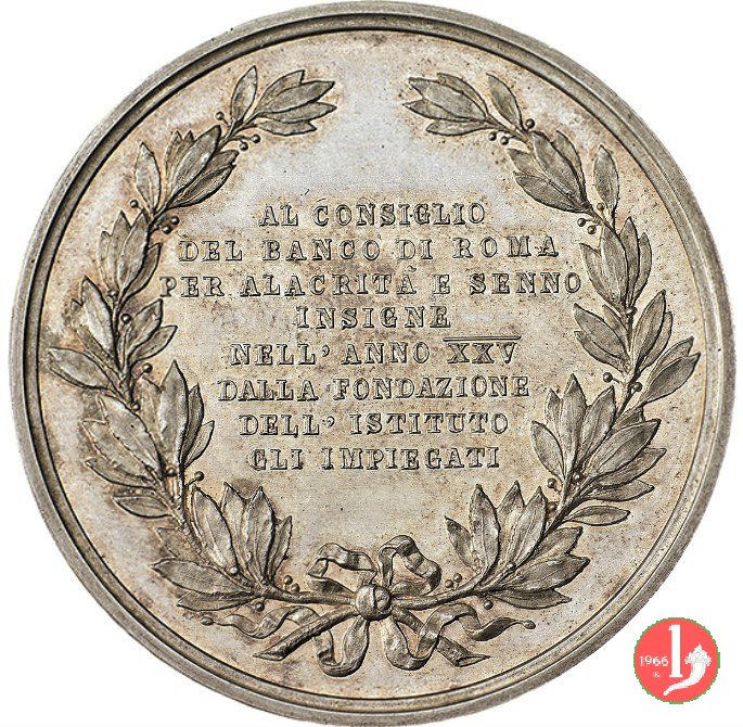 Verso: entro rami d'alloro legati in basso da nastro: AL CONSIGLIO = DEL BANCO DI ROMA = PER ALACRITA' E SENNO = INSIGNE = NELL'ANNO XXV  = DALLA FONDAZIONE = DELL'ISTITUTO = GLI IMPIEGATI
