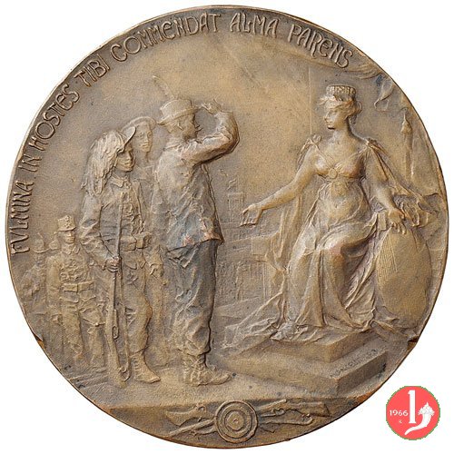 La figura allegorica, a dx, dell'Italia velata e turrita, seduta in trono, regge scudo crociato e riceve l'omaggio dei militari di vari corpi
