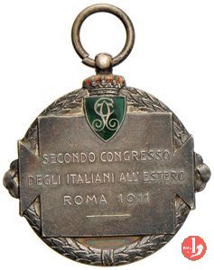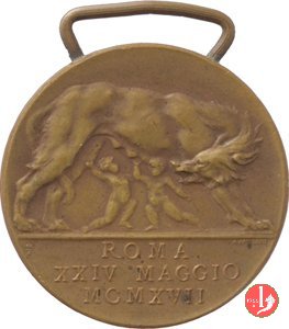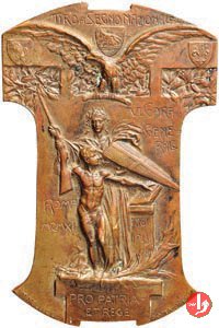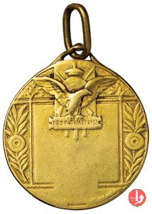 Dritto: Aquila Savoia coronata su cartiglio PRO PATRIA ET REGE, posta sopra fucili decussati e bersaglio tra rami d'alloro e quercia