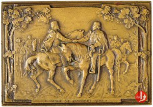 figura femminile seduta regge rami di palma e scrive verso sx su nastro orizzontale sormontato da aquila coronata sovrapposta a bersaglio e su rami d'alloro: AL MERITO