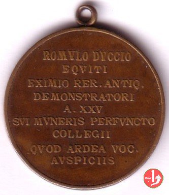 Verso: nel campo: ROMVLO DVCCIO = EQVITI = EXIMIO RER. QNTIQ. = DEMOSTRATORI = A. XXV = SVI MVNERIS PERFVNCTO = COLLEGII = QVOD ARDEA VOC. = AVSPICIIS