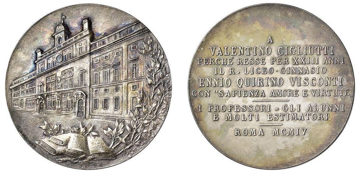 Verso: nel campo: A = VALENTINO CIGLIUTTI = PERCHE' RESSE PER XXXIII ANNI = IL R. LICEO GINNASIO = ENNIO QUIRINO VISCONTI = CON "SAPIENZA AMORE VIRTUTE" = - = I PROFESSORI - GLI ALUNNI = E MOLTI ESTIMATORI = - = ROMA MCMIV