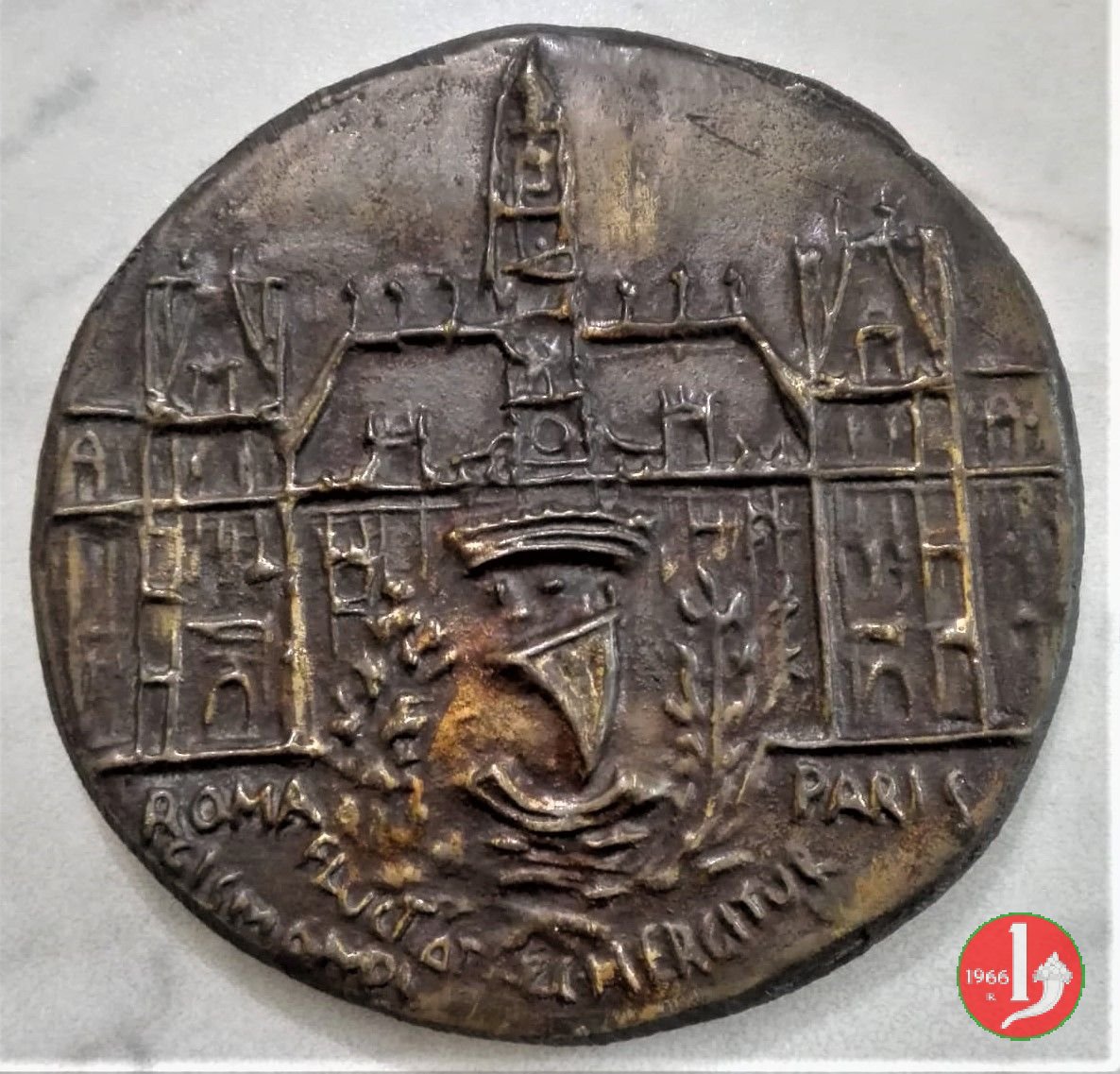 Dritto: Stemma con barca a vela coronata e tra rami d'alloro e sullo sfondo il prospetto anteriore dell'Hotel del Ville (Municipio) di Parigi