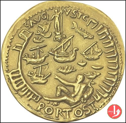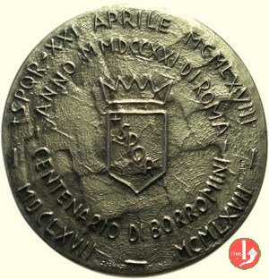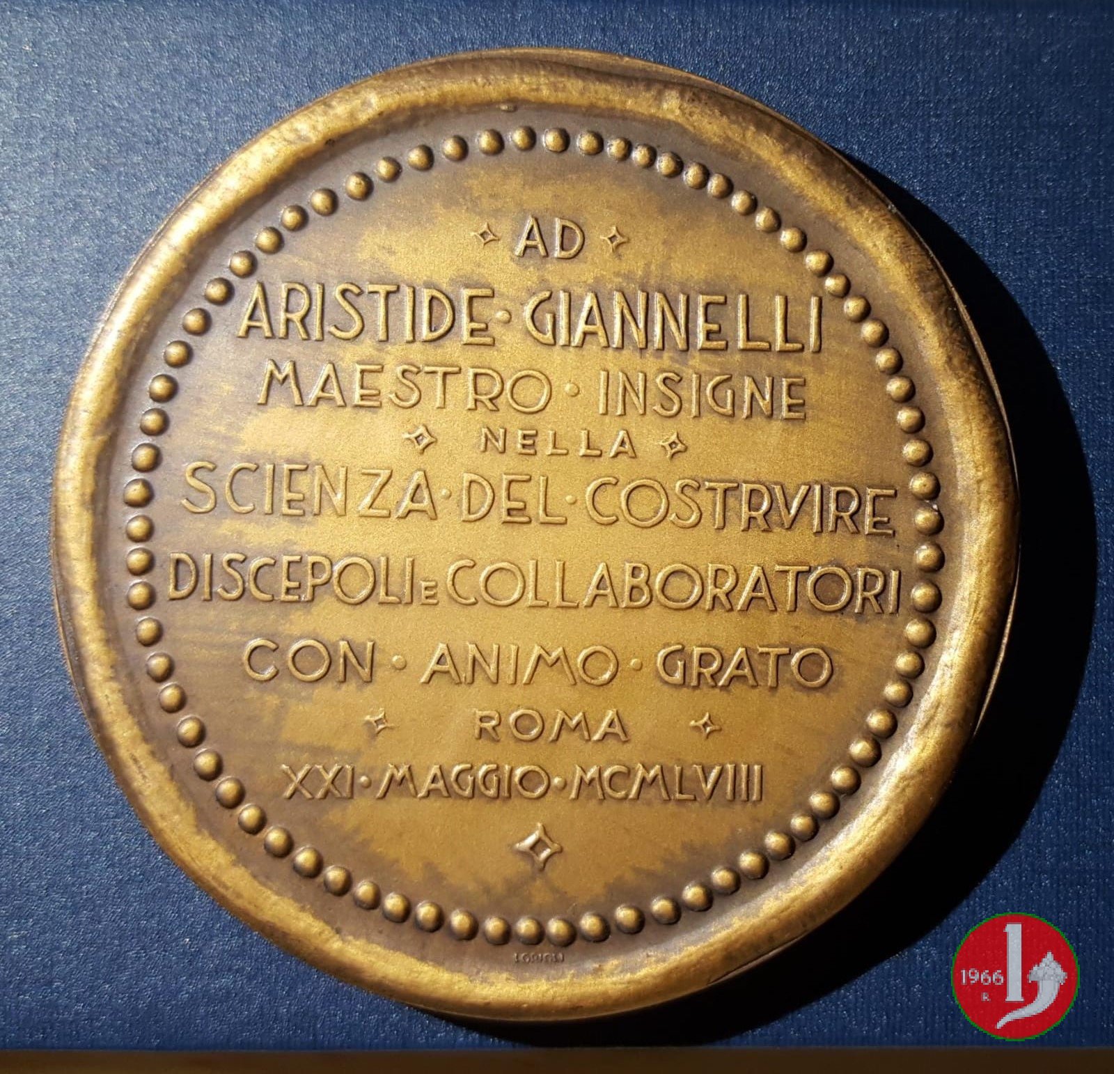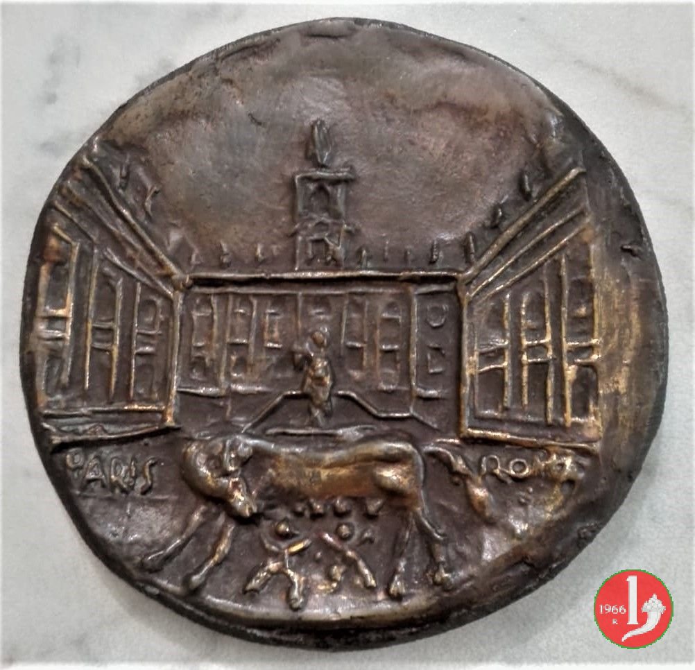 Verso: nel campo: A = VITTORIO VALLETTA = CHE REALIZZANDO L'INIZIATIVA DEL SUO PREDECESSORE = LEGO' IL NOME DELLA GRANDE INDUSTRIA CUI EGLI PRESIEDE = AL MUSEO DELLA CIVILTA' ROMANA = IL COMUNE DI ROMA = XXI APRILE 1952