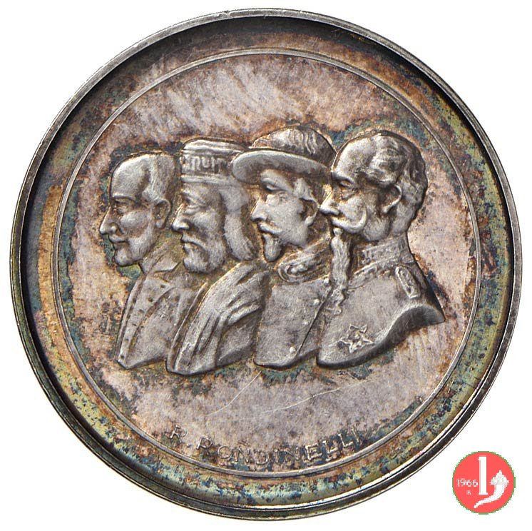 Dritto: entro cerchio continuo: busti accollati a sx di Giuseppe Mazzini, Giuseppe Garibaldi, Luigi Cadorna, Vittorio Emanuele II