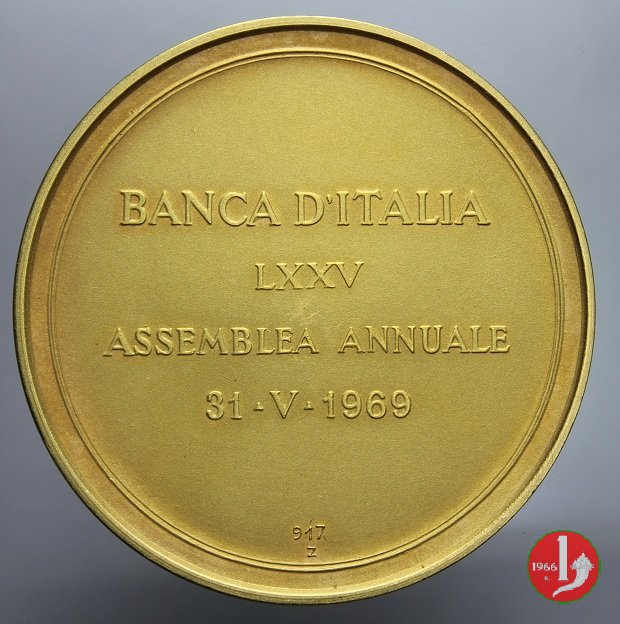 Verso: nel campo, entro doppio cerchio continuo: BANCA D'ITALIA = LXXXV = ASSEMBLEA ANNUALE = AZIONISTI = 31 - V - 1969
