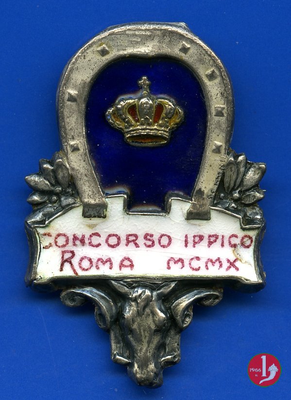 sotto entro targa sorretta da testa di cavallo tra volute: CONCORSO IPPICO = ROMA MCMX