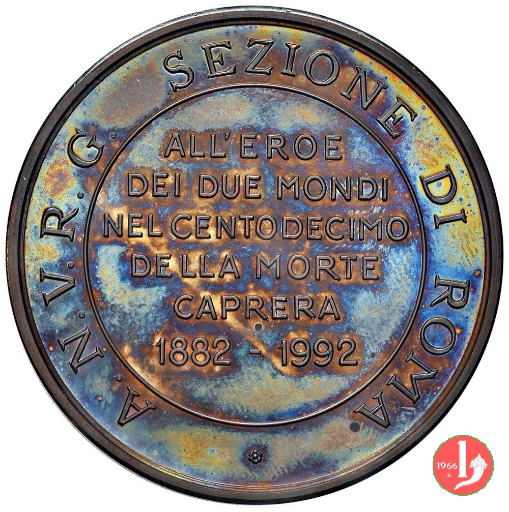 nel campo, entro cerchio continuo: ALL'EROE = DEI DUE MONDI = NEL CENTODECIMO = DELLA MORTE = CAPRERA = 1882 - 1992