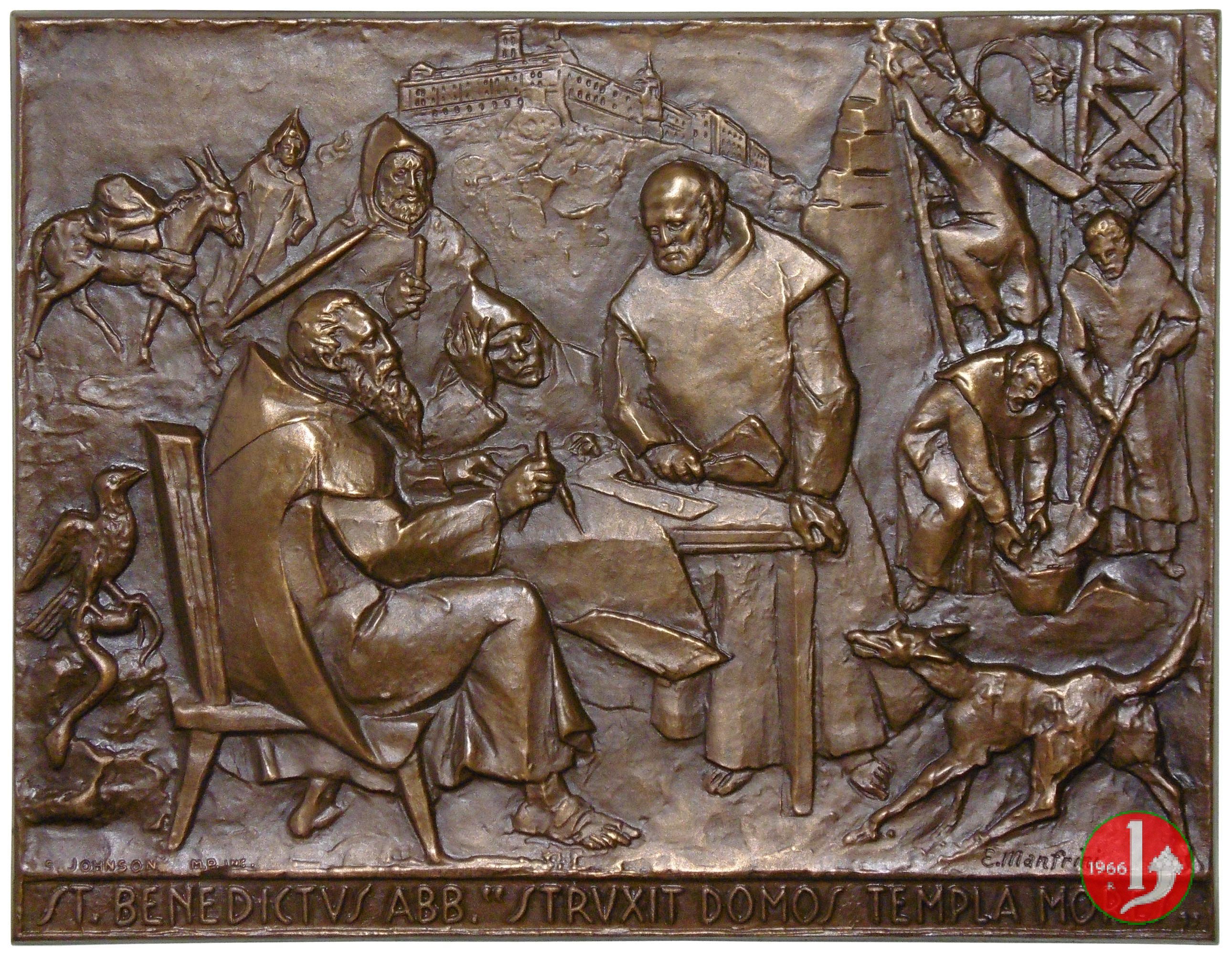 Abbazia di Montecassino Dritto: San Benedetto, seduto ad un tavolo, dirige i lavori di costruzione dell'Abbazia circondato dai frati al lavoro e in alto, sullo sfondo, l'Abbazia di Montecassino in esergo: ST. BENEDICTVS ABB. "STRVXIT DOMOS TEMPLA MORES" in basso, ai lati: S. JOHNSON _ M.P. INC. _ E. MANFRINI | |