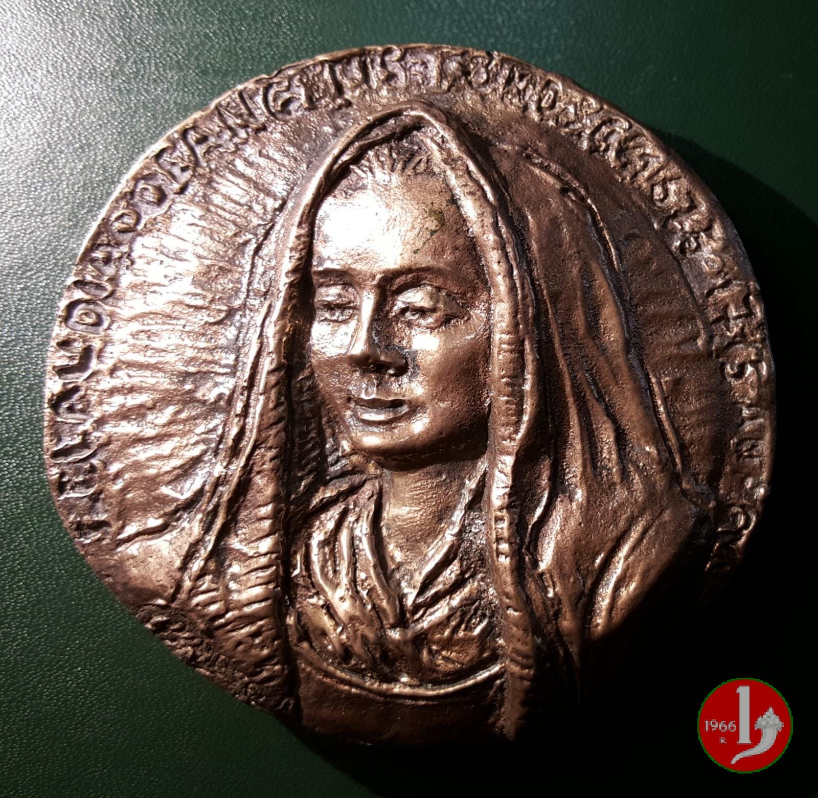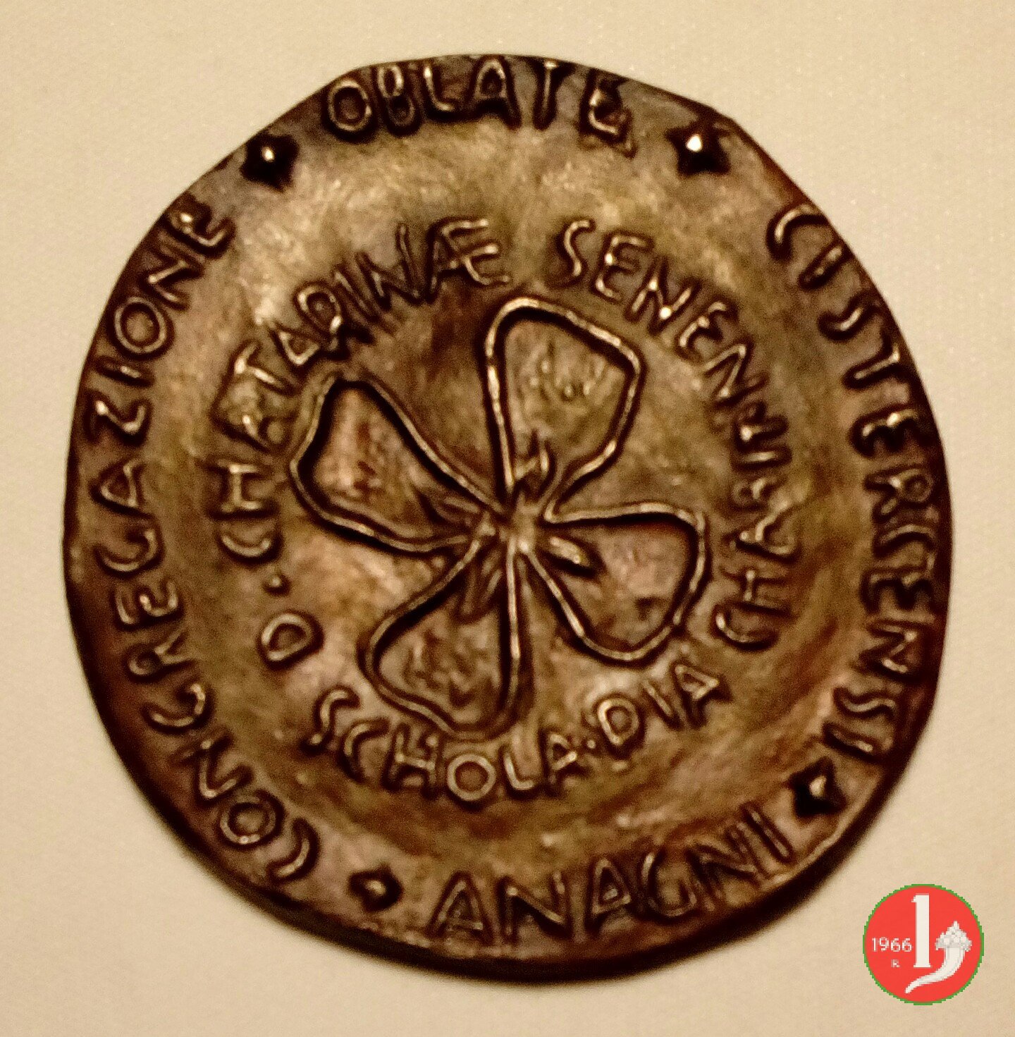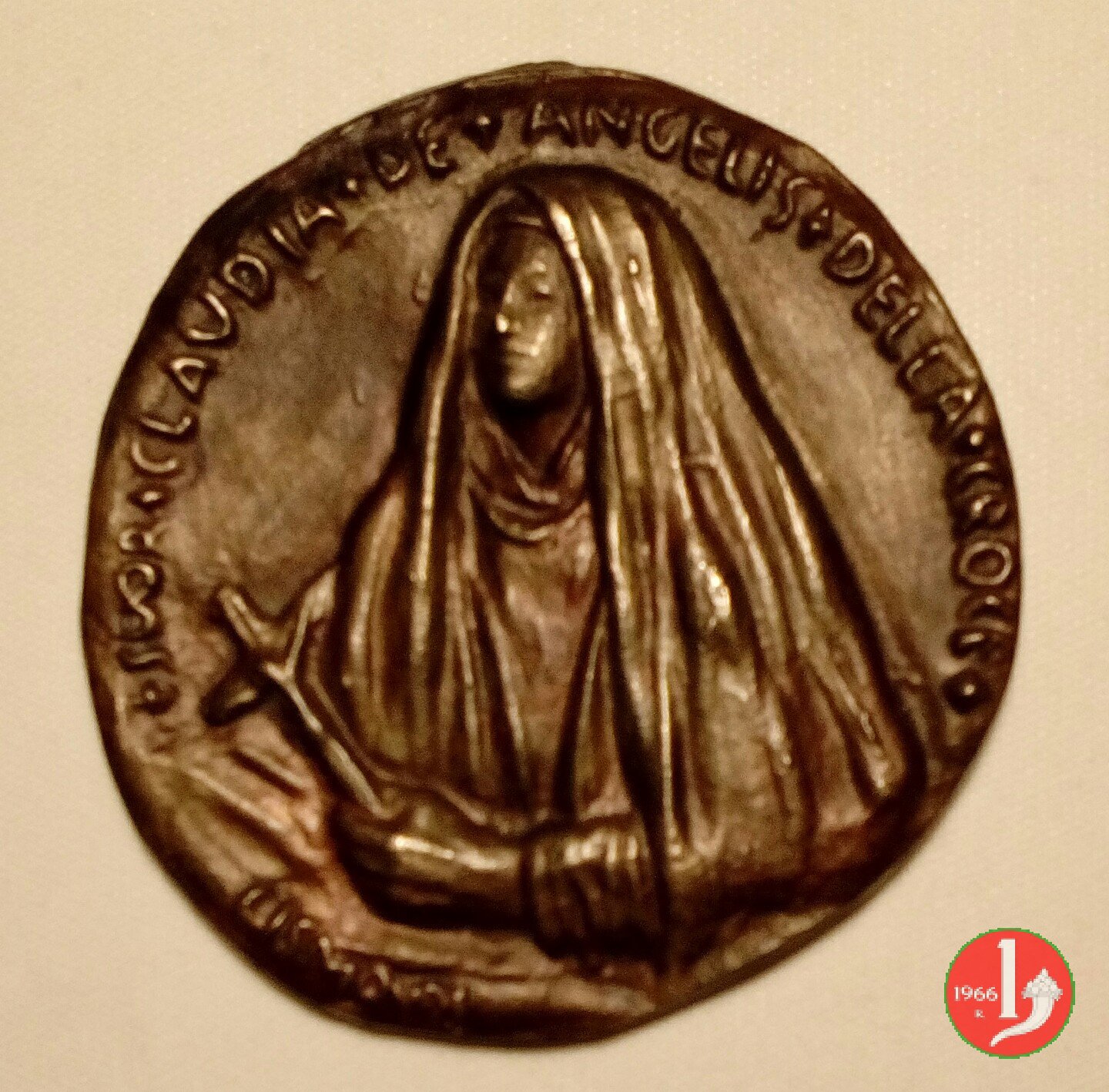 Anagni - Claudia De Angelis Dritto: _ • SUOR • CLAUDIA • DE • ANGELIS • DELLA • CROCE • busto velato con abito talare di 3/4 a sx regge Croce in basso: GISMONDI logo della Scuola Pia della Carità in Anagni delle Suore Oblate Cistercensi: D • CHATARINAE SENEN = SCHOLA PIA CHARIT • con al centro quadrifoglio | |