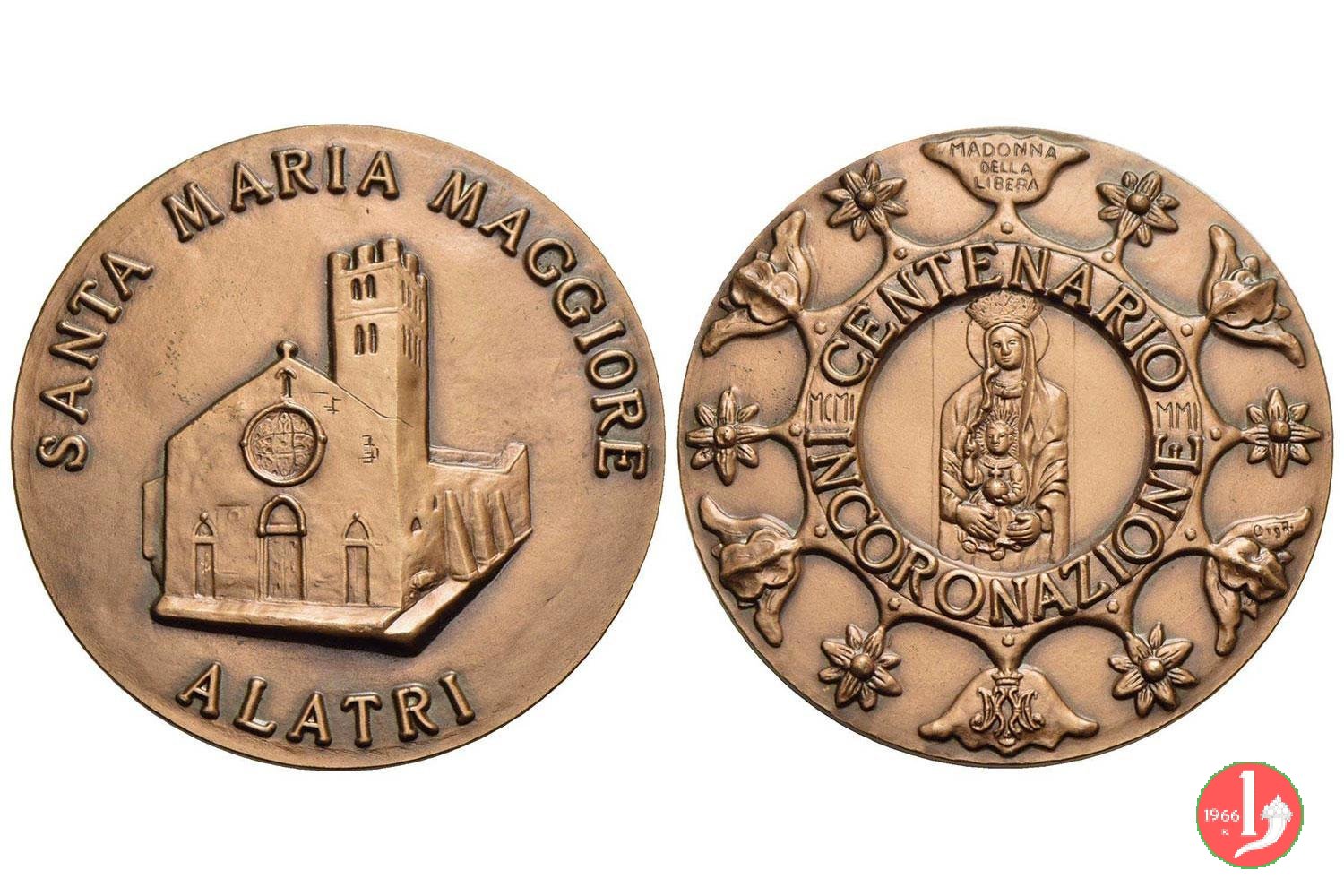 Alatri - Santa Maria Maggiore 2001 Dritto: SANTA MARIA MAGGIORE = ALATRI Vista della Chiesa di Santa Maria Maggiore in Alatri al centro su cornice che unisce gli steli dei fiori e dei calici florali posti sul contorno: CENTENARIO = INCORONAZIONE _ MCMI _ MMI al centro la B. V. Maria coronata, nimbata e velata con il Bambino Gesú benedicente sotto monogramma: MA a dx su calice floreale: ORGA (?) | |
