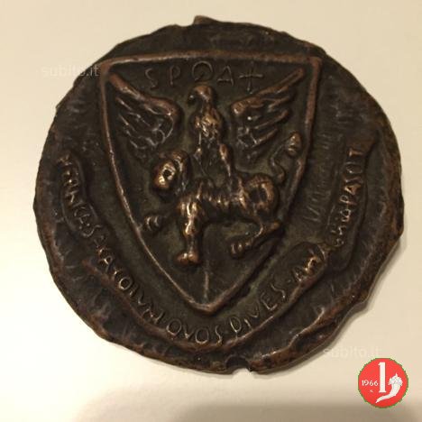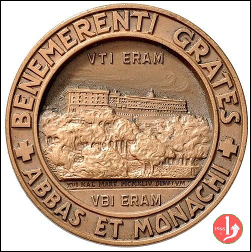 Per Ricostruzione Abbazia di Montecassino 1946 Dritto: BENEMERENTI GRATES ✠ ABBAS ET MONACHI ✠ vista panoramica dell'Abbazia nel campo, in alto: VTI ERAM in esergo: XVI KAL MART. MCMXLIV DIRVTVM = VBI ERAM tronco di quercia tagliato dal quale escono virgulti in basso, ai lati: JOHNSON _ F.V. | |