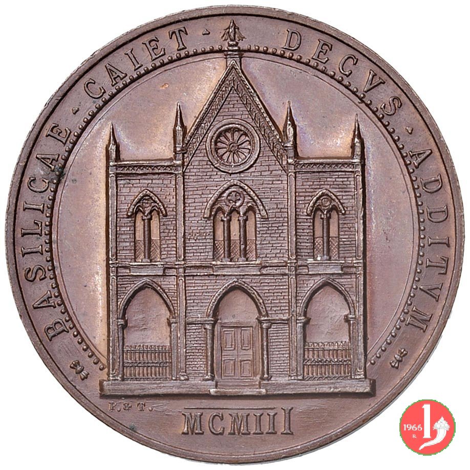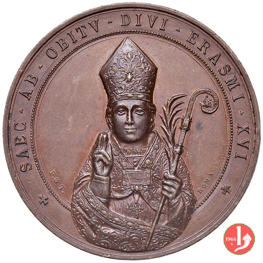 Gaeta - Cattedrale dei Santi Erasmo e Marciano e di S. M. Assunta 1903 Dritto: ✠ SAEC • AB • OBITV - DIVI • ERASMI • XVI ✠ entro cornice circolare perlinata interrotta in basso: busto del Santo benedicente di fronte con mitra, Croce pettorale, piviale, pastorale e ramo di palma entro il cerchio interno ai lati: P. & T. _ ROMA entro cornice circolare perlinata interrotta in basso: Prospetto anteriore della Cattedrale di Gaeta dedicata ai Santi Erasmo e Marciano e di S. M. Assunta sotto a sx: P. & T. in basso: MCMIII | |