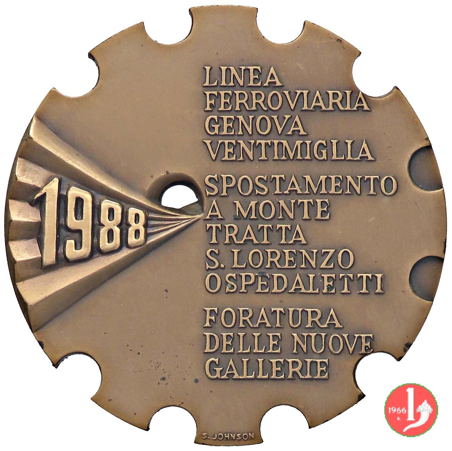 Gallerie Autotrada Genova-Ventimiglia 1988 Dritto: ENTE FERROVIE DELLO STATO Vista di un tratto di autostrada con galleri a sullo sfondo; sul guard rail 1980 in basso: COGEFAR nel campo a dx, in alto: LINEA = FERROVIARIA = GENOVA = VENTIMIGLIA al centro: SPOSTAMENTO = A MONTE = TRATTA = S. LORENZO = OSPEDALETTI sotto: FORATURA = DELLE NUOVE = GALLERIE in basso: S. JOHNSON | |