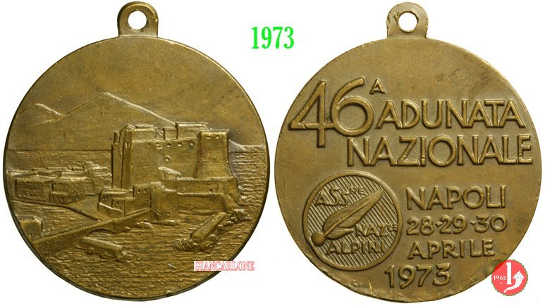 46- Napoli 1973 Dritto: vista di Castel dell'Ovo col Vesuvio sullo sfondo Verso: nel campo: 46a ADUNATA = NAZIONALE = NAPOLI = 28 • 29 • 30 = APRILE = 1973 in basso,a sx: logo ANA sotto: S. | |