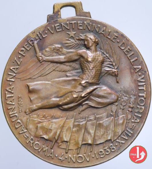 Adunata Nazionale 20° della Vittoria a Roma 1938 Dritto: ADVNATA • NAZ • PER • IL • VENTENNALE • DELLA • VITTORIA = ROMA • 4 • NOV • 1938 • XVII = la figura allegorica della Vittoria alata, con stella in capo e in volo verso dx, regge ramo di palma e gladio, su bandiere e labari nel campo a sx: M = IS = TR = VZ = ZI Elmetto su baionetta e ramo di quercia nel campo a sx: S.A. = PAGANI | |