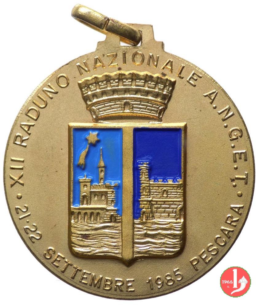 12- Pescara 1985 Dritto: XII RADUNO NAZIONALE A.N.G.E.T. = • 21 • 22 SETTEMBRE 1985 PESCARA • Stemma turrito Bandiera dell'Associazione Nazionale Genieri e Trasmettitori |