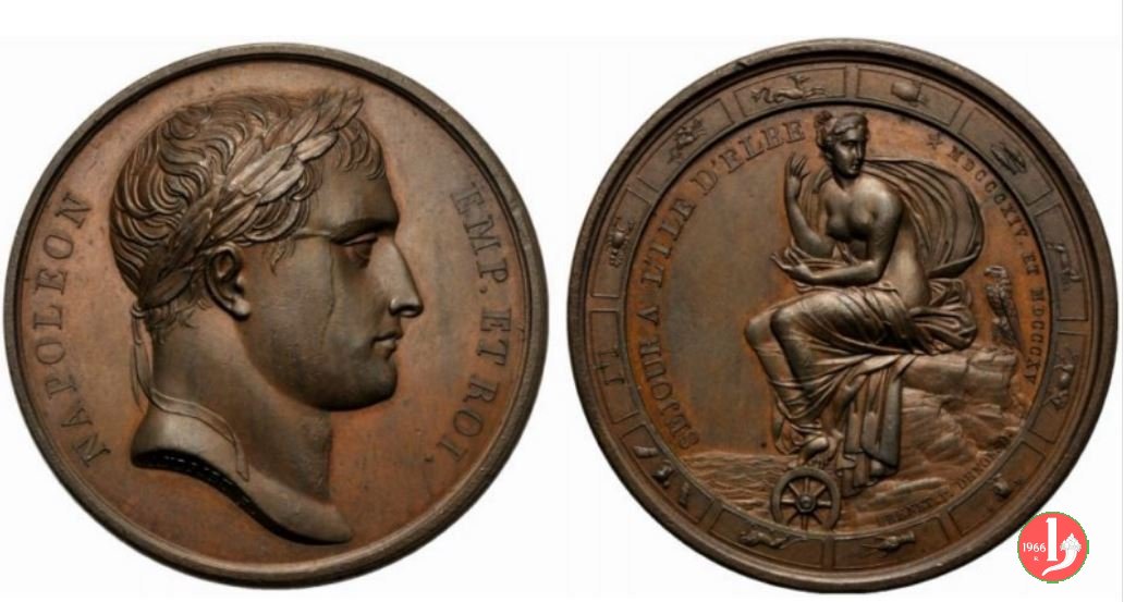 Soggiorno all'Isola d' Elba -B1585 Dritto: NAPOLEON testa a dx sul taglio del collo: ANDRIEU • F • figura allegorica, velata, diademata, seduta su uno scoglio verso sx e volta di 3/4 a sx, mira ad aquila e ruota con i piedi timone in basso, a dx: BRENET. F. DENON D. | |