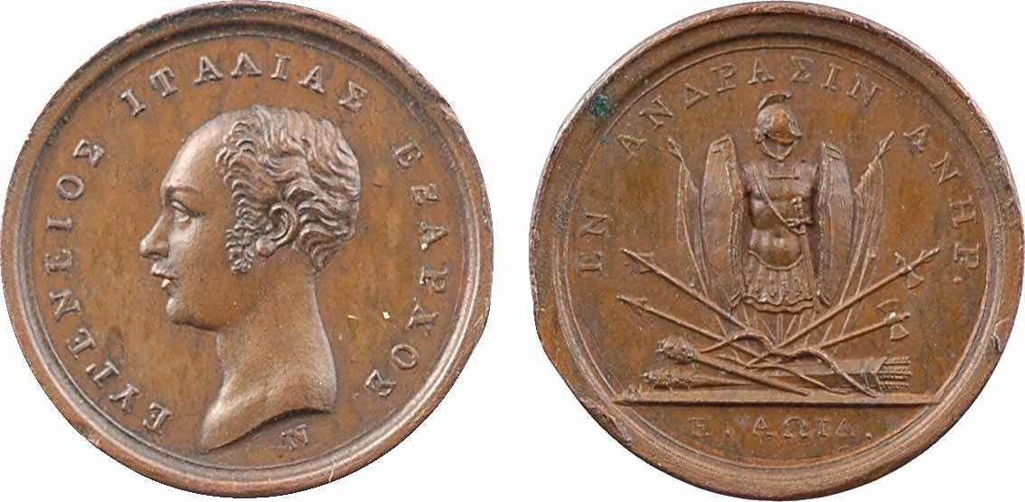 Eugenio di Beauharnais -B1836 Dritto: EYGENEIO ![]() ITA![]() IA![]() EXAPXO![]() ![]() busto nudo a sx sotto: N trofeo d'armi con armatura elmata scudi, bandiere, clave, arco, faretra e lance in esergo: E. A | |