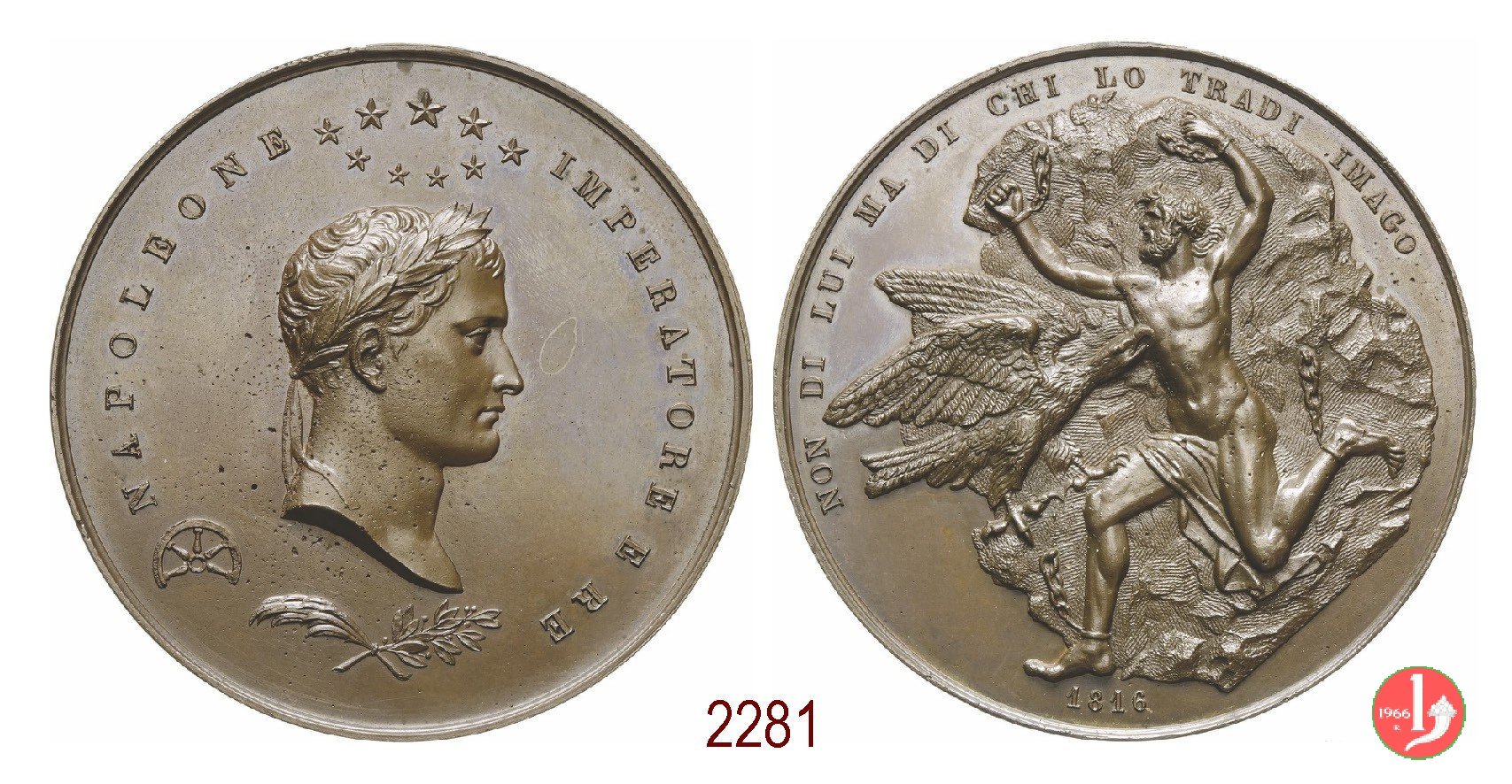 Napoleone a Sant'Elena 1816 -B1785 Dritto: NAPOLEONE _ IMPERATORE E RE testa laureata a dx sormontata da nove stelle disposte a mandorla in basso a sx: timone spezzato sotto: rami d'alloro e di palma decussati Prometeo seminudo e con aquila, volto a sx, spezza le catene sotto: 1816 | |