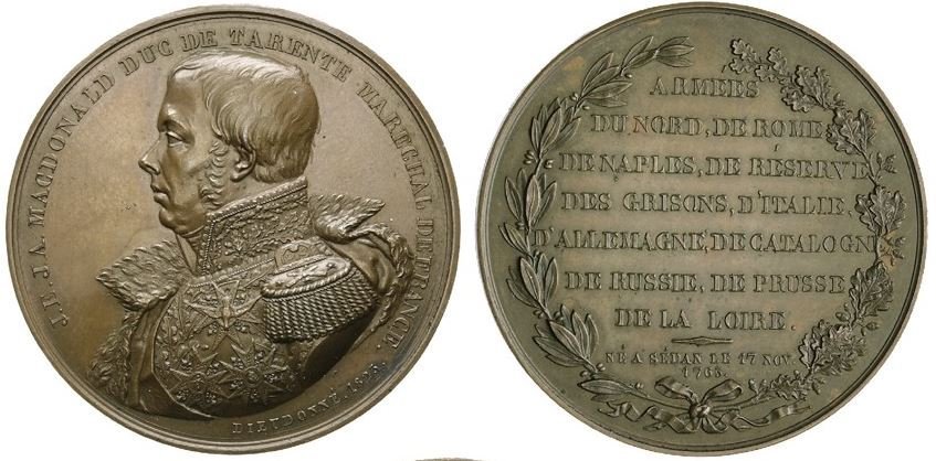 Jacques Étienne Joseph Alexandre MacDonald 1825 -B1883 Dritto: J • E • J • A • MACDONALD DUC DE TARENTE MARECHAL DE FRANCE • Busto a sx con divisa militare riccamente ornata, mantello di pelliccia e decorazioni sotto: DIEUDONNÉ • 1825 • | |