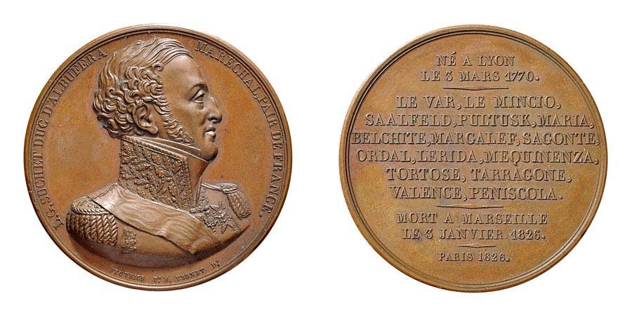 Louis Gabriel Suchet 1826 -B1884 Dritto: L. G. SUCHET DUC D'ALBUFERA MARCHAL, PAIR DE FRANCE busto in uniforme a dx con collo ricamato da foglie di quercia, decorazioni e fascia sotto: PEUVRIER F.t VERNET D.t | |