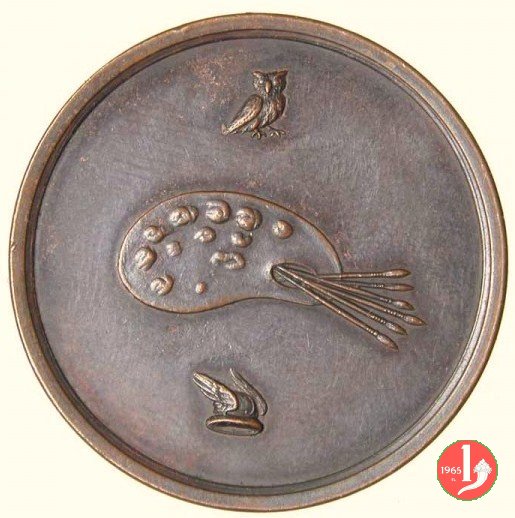 Scuola Francese di belle arti Roma -B1178 Dritto: ECOLE FRANÇAISE DES BEAUX ARTS A ROME RETABLIE ET AUGMENTÉE PAR NAPOLEON EN 1803. * entro rami d'alloro, legati in basso da nastro e affiancati da trapano e banco da lavoro, martello e scalpello, tavolozza e pennelli, compasso e squadro, lira: testa di Minerva elmata a sx in esergo: E. GATTEAUX. ROME. = 1812. | |