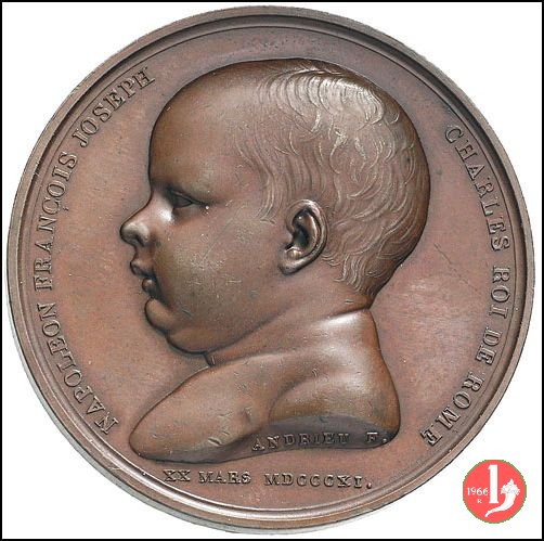 Nascita del Re di Roma 1811 -B1100 Dritto: NAPOLEON FRANÇOIS JOSEPH _ CHARLES ROI DE ROME busto a sx del Re di Roma sul taglio spalla: ANDRIEU F. sotto: XX MARS MDCCCXI. sotto: ANDRIEU F. | |