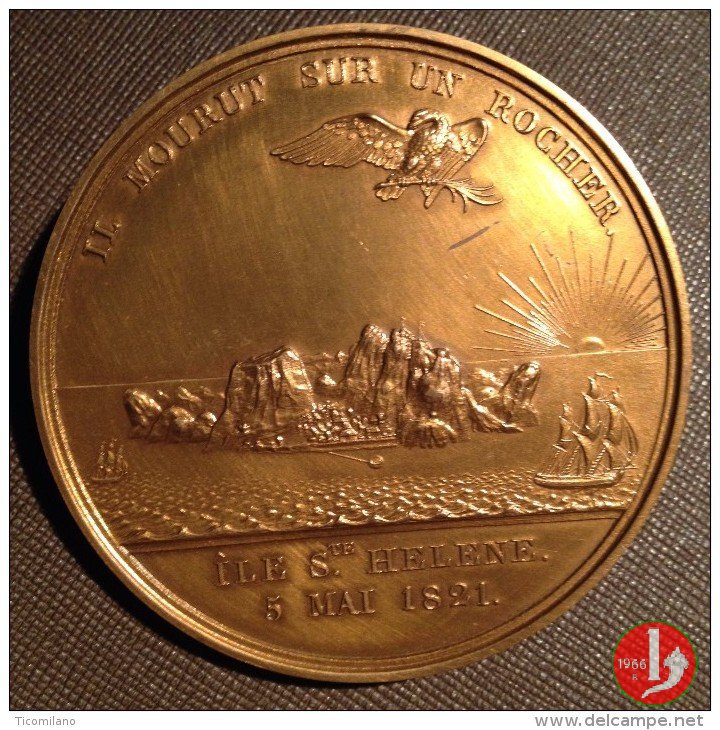 Morte di Napoleone -B1844 Dritto: entro ghirlanda d'alloro e quercia, fermata da nastri sul perimetro, con iscrizioni: busto laureato a dx sul nastro: RIVOLI _ PYRAMIDES _ MARENGO _ CUNEVILLE _ AMIENS _ CODES _ LEG. D HON. _ AUSTERLITZ _ LENA _ TILSIE _ SIMPLON _ WAGRAM vista dell'isola di Sant'Elena con sole al tramonto nel mare e in alto aquila che reca ramo di palma in esergo: ILE S.te HELENE. = 5 MAI 1821. | |