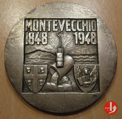 100° Miniera di Montevecchio 1948 Dritto: entro riquadro: lanterna raggiante su crogiolo tra gli stemmi di Sardegna e di Venezia e in alto MONTEVECCHIO = 1848 _ 1948 Verso: entro riquadro: Minatore con martello pneumatico scava verso sx entro il riquadro in basso a sx: E. MONTI sotto a dx: S. JOHNSON |
