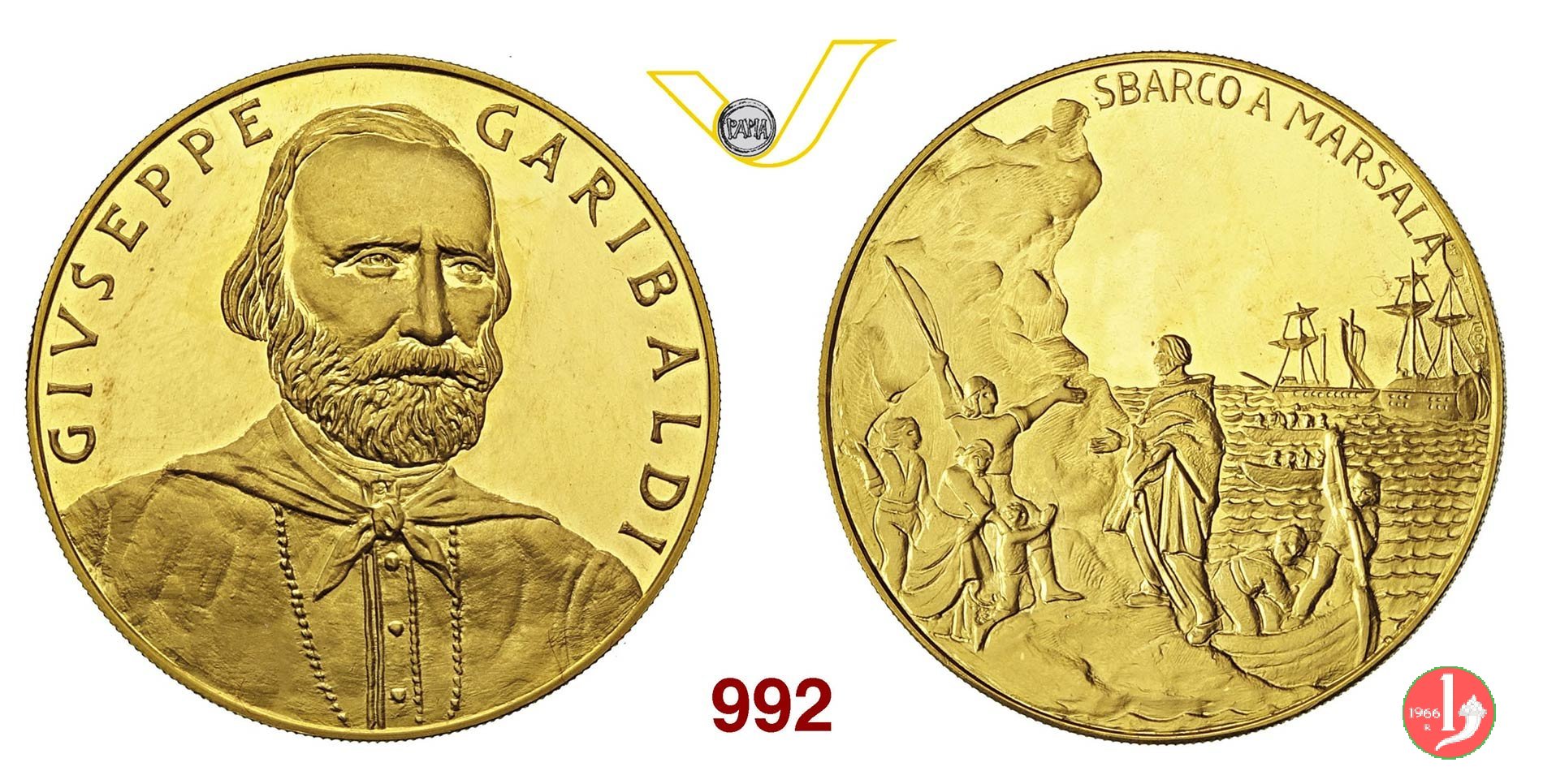 100° Sbarco dei Mille a Marsala Dritto: GIUSEPPE _ GARIBALDI busto di 3/4 a dx con camicia, catena e fazzoletto annodato al collo Scena dello Sbarco con famiglia che riceve il generale sullo scoglio sventolando bandiera | |