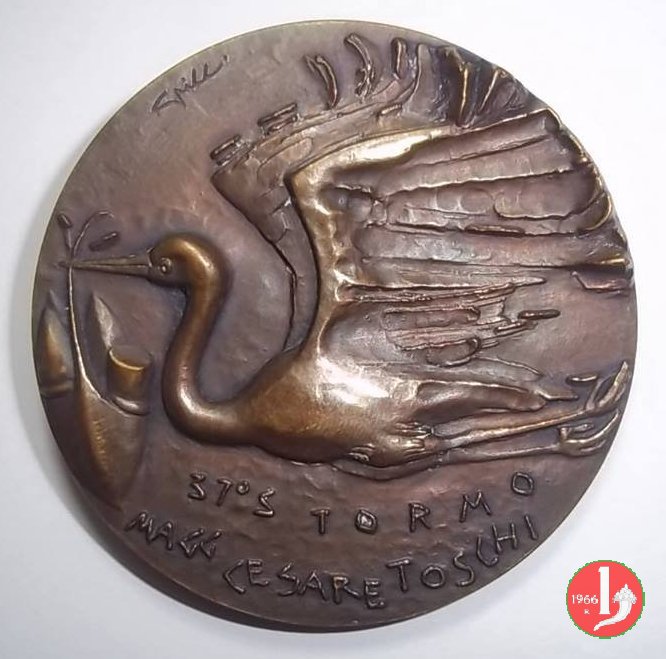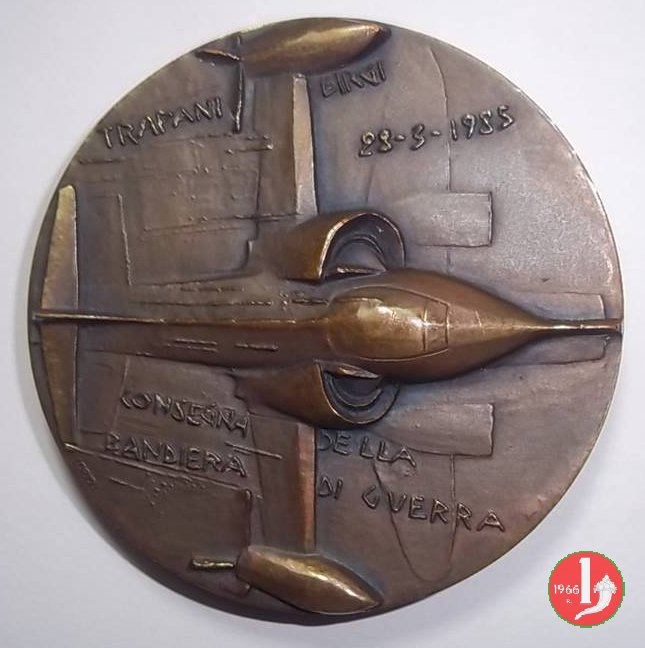 37° Stormo Nato di Trapani 1985 Dritto: Cicogna in volo verso sx regge sacca sotto: 37° STORMO = MAGG. CESARE TOSCHI in alto, corsivo: GRLLI in alto, ai lati: TRAPANI _ BIRGI = 28-3-1985 in basso, ai lati: CONSEGNA _ DELLA = BANDIERA _ DI GUERRA |