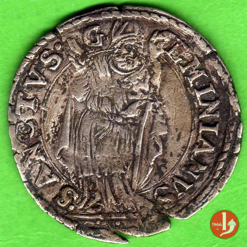 Giorgino con Santo con la città in mano Dritto: o CAESAR o DVX o MVT o REG o E o C o Busto a sinistra. Il Santo, mitrato, genuflesso a destra, regge con la sinistra la città e tiene la destra distesa in atto di pregare; dall'alto un fascio di raggi sulla città. | |