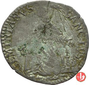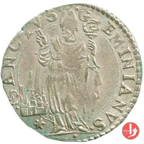 Giorgino con Santo seduto Dritto: • CAESAR • DVX • MVT • REG • E • C • Testa a sinistra. S. Geminiano mitrato, seduto in terra, a sinistra, in atto di cacciare due diavoli dal corpo di una donna che gli sta davanti in ginocchio spaventata e con le braccia aperte, a inistra, sotto la mano destra della donna, piccola corona. | |