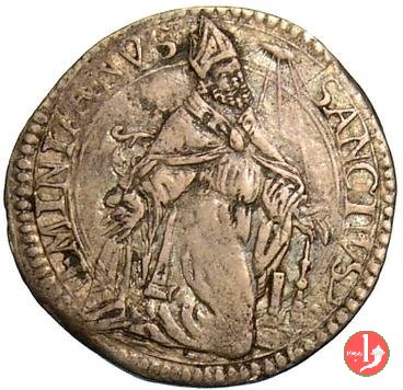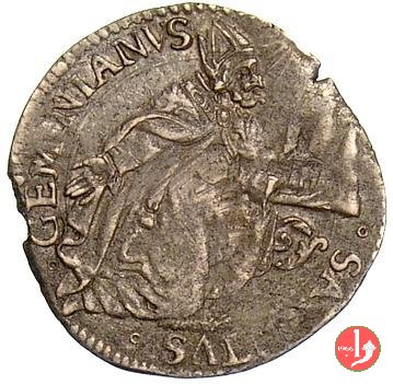 Giorgino con busto a destra e Santo genuflesso Dritto: Busto corazzato del duca rivolto a destra. il Santo tiene ambo le braccia distese e aperte in atto di pregare sulla città, che si trova in basso a destra: dall'alto, fascio di raggi. | |